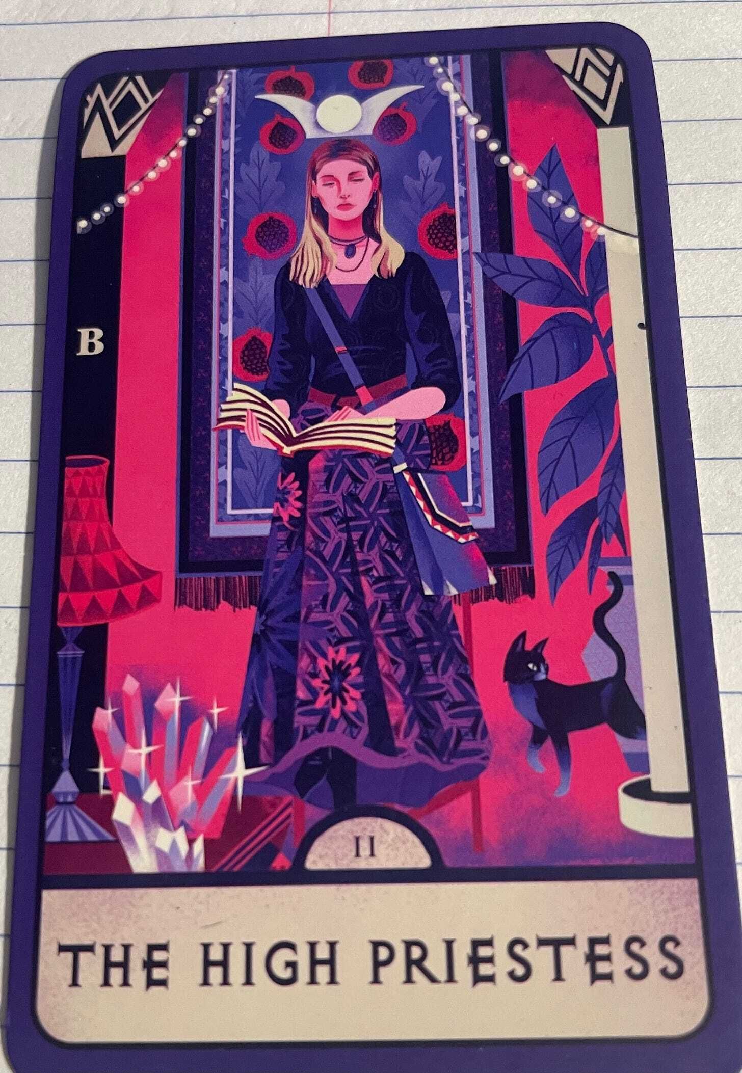 Anyway, I pulled the High Priestess. Tarot is split up between the Major Arcana and the Minor Arcana. The Major Arcana is made up of 22 cards(usually), beginning with the fool and ending with The World. The Major Arcrana’s cards each hold a universal lesson, something that we all experience, while the Minor arcana is more day to day information. Pulling a Major Arcana card represents massive changes that will help you grow. On the flip side, when the card is reversed or upside down, it usually means denial, and the need for attention and true seeking for your query.